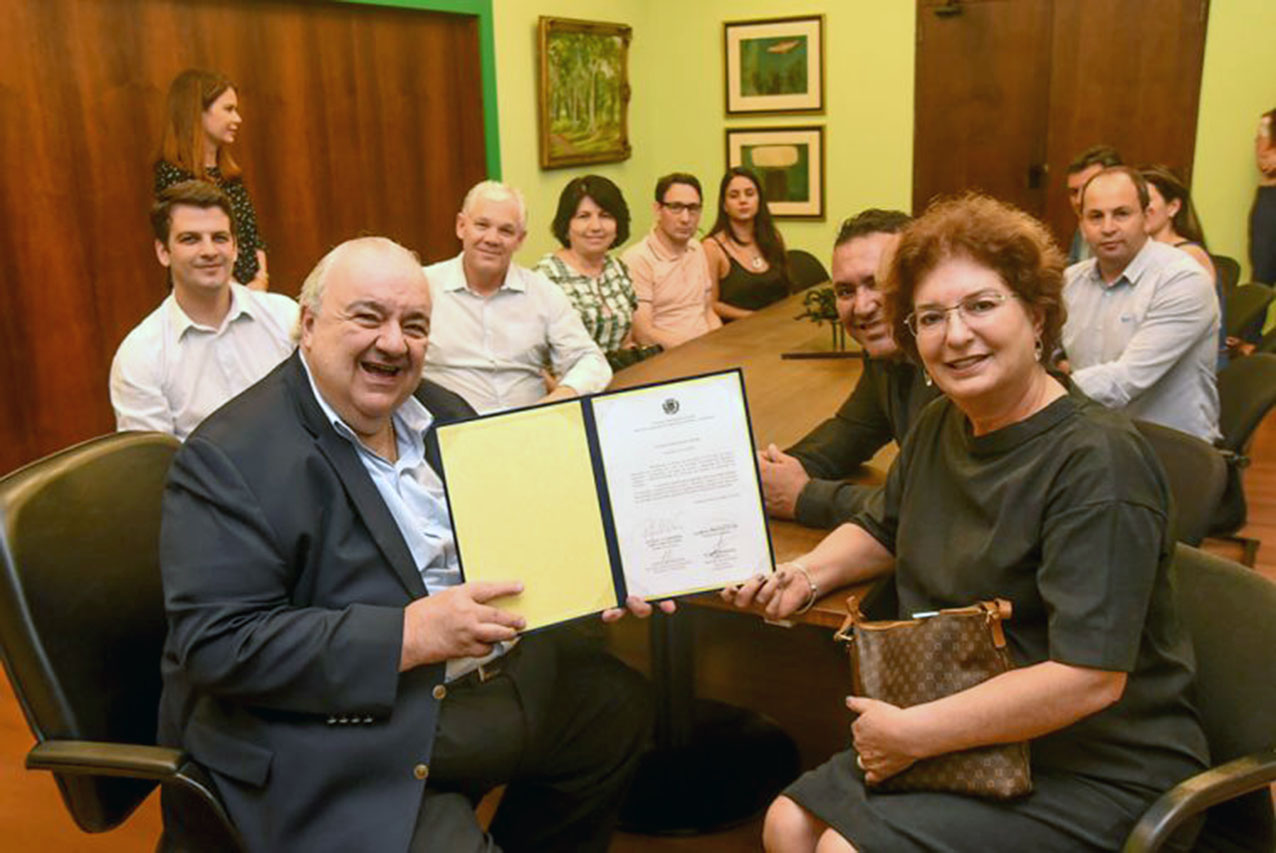 A prefeita Beti Pavin, acompanhada do vice-prefeito Sergio Pinheiro e do secretário de Agricultura e Abastecimento, Marcio Toniolo, assinou o Termo de Cooperação Técnica entre Colombo e Curitiba para a implantação do Armazém da Família, na terça-feira, dia 05. A cerimônia aconteceu no Salão das Gralhas Azuis, da Prefeitura de Curitiba.