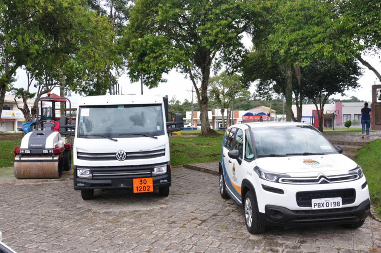 A Prefeitura recebeu três novos veículos: um automóvel, um caminhão e um rolo compactador