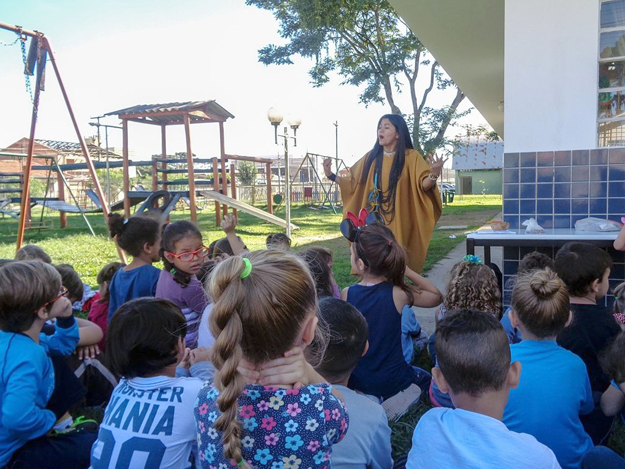 Na quarta-feira (10), o CMEI Vó Charlote recebeu a visita da indígena Kixirá Mar, nativa brasileira, natural do estado do Acre. A índia contou para os alunos a história chamada de “Jamandi”, que significa gente da mata, que ouvia quando era criança, além de falar sobre a cultura do povo de sua tribo.
