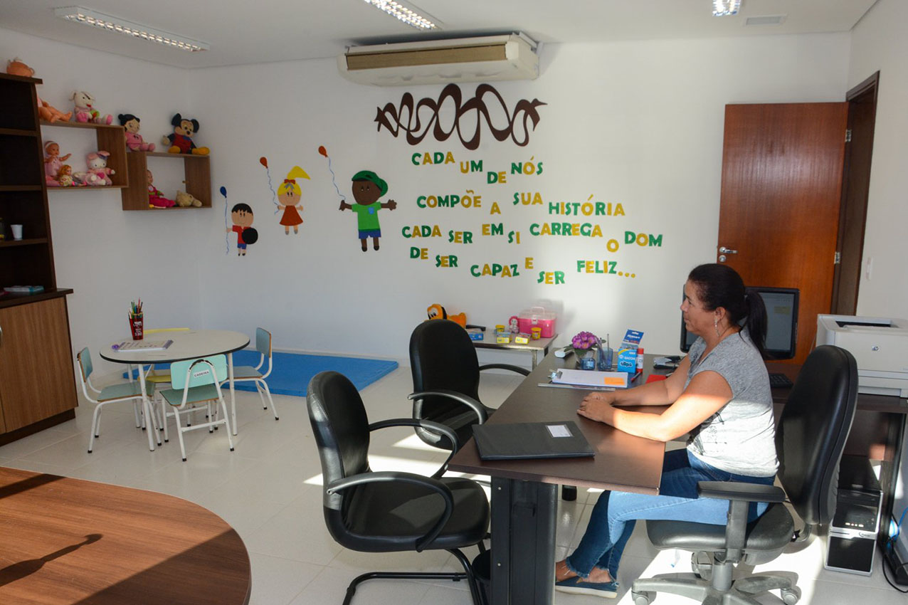 A intenção da “Sala de acolhimento” é dar receptividade e conforto a vítima, desestigmatizando o ambiente hostil de uma delegacia e ficando disponível para atendimento individual. Por isto, o espaço é amplo e tem uma área kids, com brinquedos, tapetes, lápis e material para colorir, permitindo que a criança se sinta mais a vontade enquanto a mãe é ouvida.