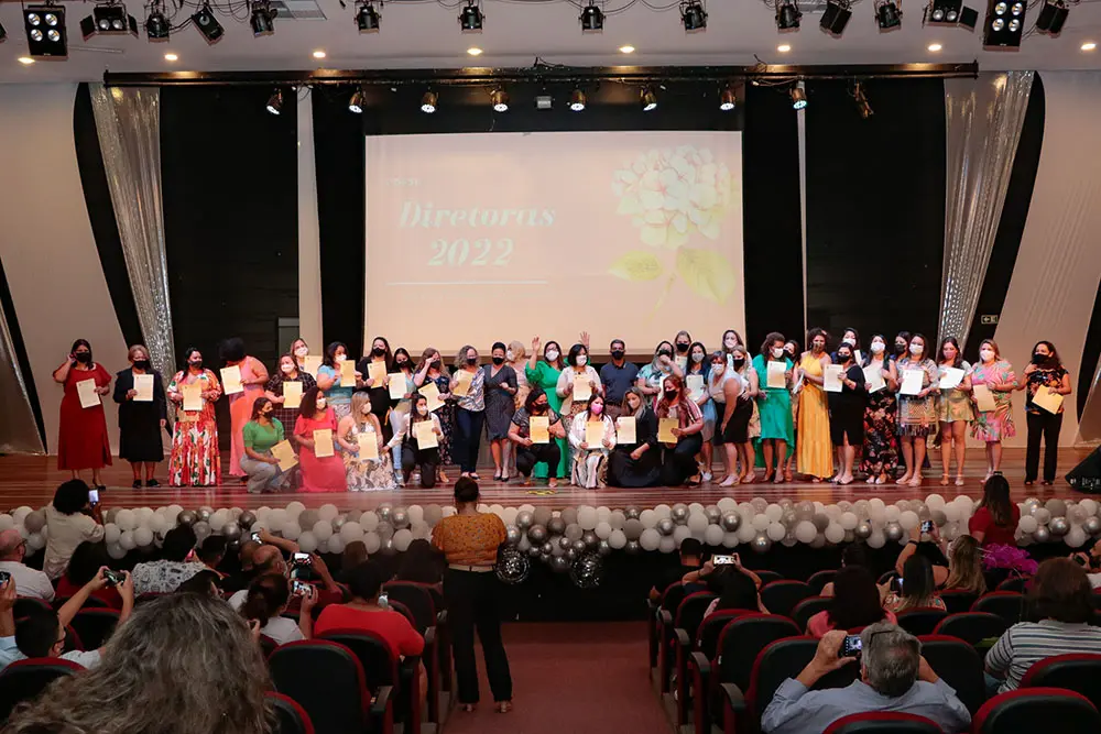 Na tarde da última quarta-feira (15), foram empossadas as diretoras das escolas municipais e centros municipais de educação infantil (Cmeis) do município que estarão à frente das unidades entre os anos de 2022 a 2024. Durante o evento, que teve como local o Cenforpe, também foram homenageadas as diretoras que encerraram suas gestões.