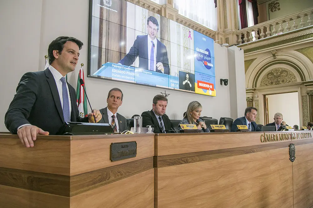 O prefeito de Curitiba em exercício, Eduardo Pimentel, participou da abertura da sessão da Câmara Municipal da capital paranaense na manhã do dia 19 de outubro, quarta-feira. Ao cumprimentar os vereadores, Pimentel destacou os principais avanços da gestão municipal e reforçou a boa relação entre os poderes na construção de uma cidade melhor.