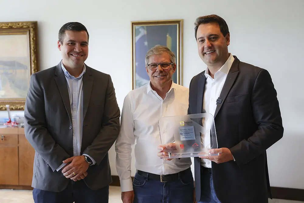O governador Carlos Massa Ratinho Júnior comemorou na quarta-feira, dia 14, o prêmio recebido pelo Estado graças ao programa Casa Fácil Paraná. O troféu Selo de Mérito, que reconhece as melhores práticas do poder público voltadas ao setor no Brasil, foi entregue no evento Fórum Nacional de Habitação de Interesse Social (FNHIS), na última semana, em Brasília.