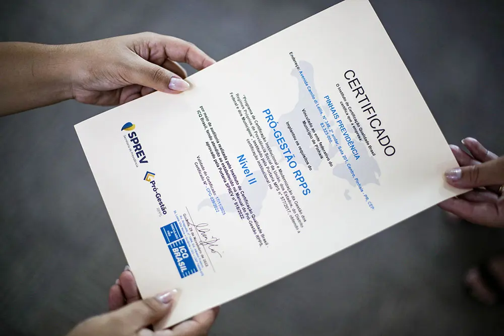 O Pinhais Previdência acaba de renovar a Certificação Pró-Gestão RPPS (Regimes Próprios de Previdência Social) em nível II, por meio de processo de auditoria externa. Para conquistar a renovação da certificação obtida em 2019, os processos, atividades, servidores e membros de colegiados do Pinhais Previdência foram submetidos à análise de auditor do ICQ Brasil e de comissão da Secretaria de Previdência.