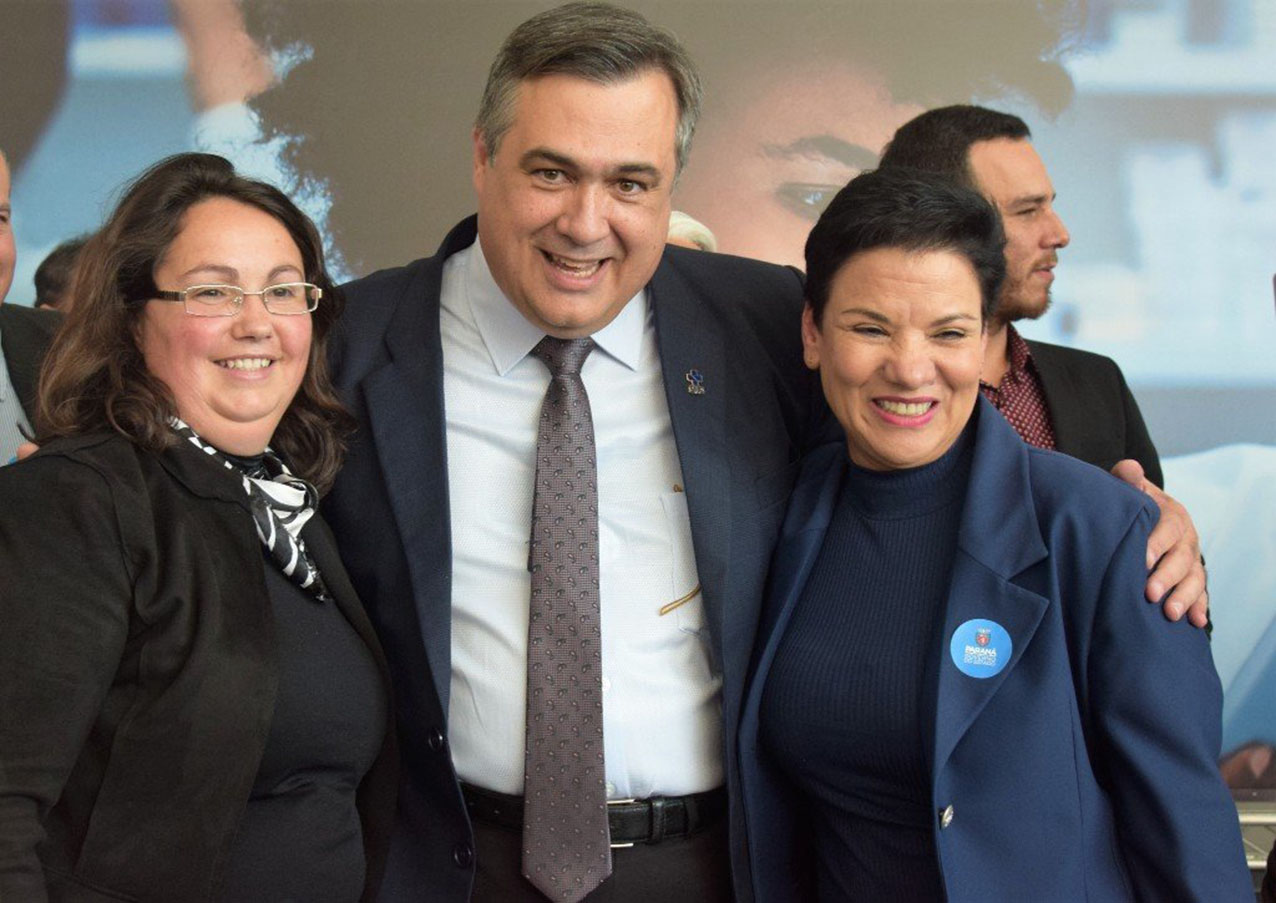 A prefeita de Pinhais, Marli Paulino, e a secretária municipal de Saúde, Adriane da Silva Jorge Carvalho, participaram do evento de liberação de recursos referentes à contrapartida estadual para aquisição de medicamentos pelo Consórcio Paraná Saúde. De acordo com o governo do Estado, serão R$ 52 milhões em recursos liberados, o que garantirá economia de pelo menos 40% na compra direta dos produtos.