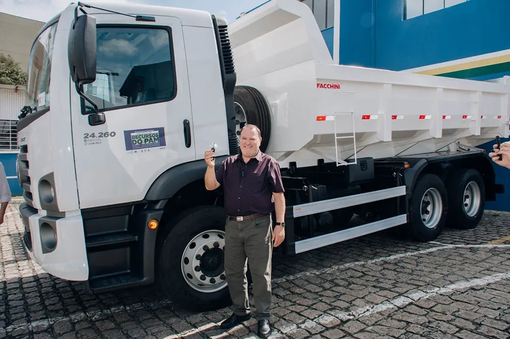 O prefeito Loreno Bernardo Tolardo acompanhou o recebimento do caminhão zero quilômetro, que soma investimentos de R$ 530 mil, dos quais R$ 340 mil provêm de recursos do PAM, da Secretaria das Cidades, e R$ 189.990,00 de recursos municipais.