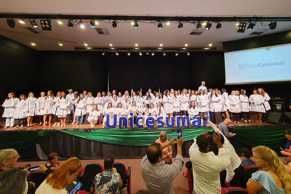 O auditório do Cenforpe-Pinhais abrigou a tradicional Cerimônia do Jaleco dos alunos da UniCesumar dos cursos de Saúde e Bem-Estar, na noite de 16 de fevereiro. Mais de 60 alunos dos cursos de Biomedicina, Farmácia, Nutrição, Estética e Cosmética, Podologia e Terapias Integrativas e Complementares participaram da tradicional celebração que carrega a bonita simbologia de vestir oficialmente o jaleco como ato de transição ao ambiente hospitalar e clínico. Ou seja, quando os alunos passam da teoria para a prática dos conteúdos ministrados nas aulas.